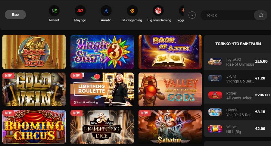 - Игры:Игровые автоматы, рулетка, блэкджек, живые дилеры