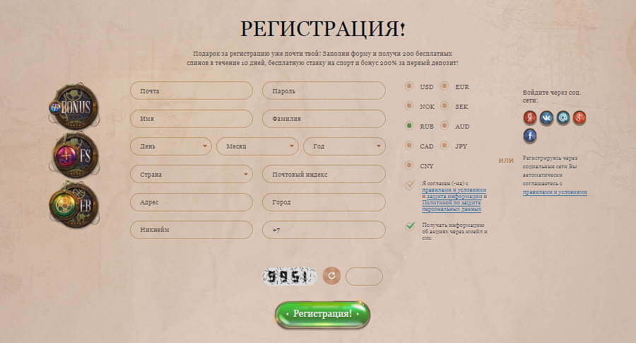 Также действует уникальная система получения фриспинов. При первом пополнении счета, Вы получаете 20 бесплатных вращений, и по 20 фриспинов каждый день в течении 9 дней. Всего вы получаете 200 бесплатных вращений.